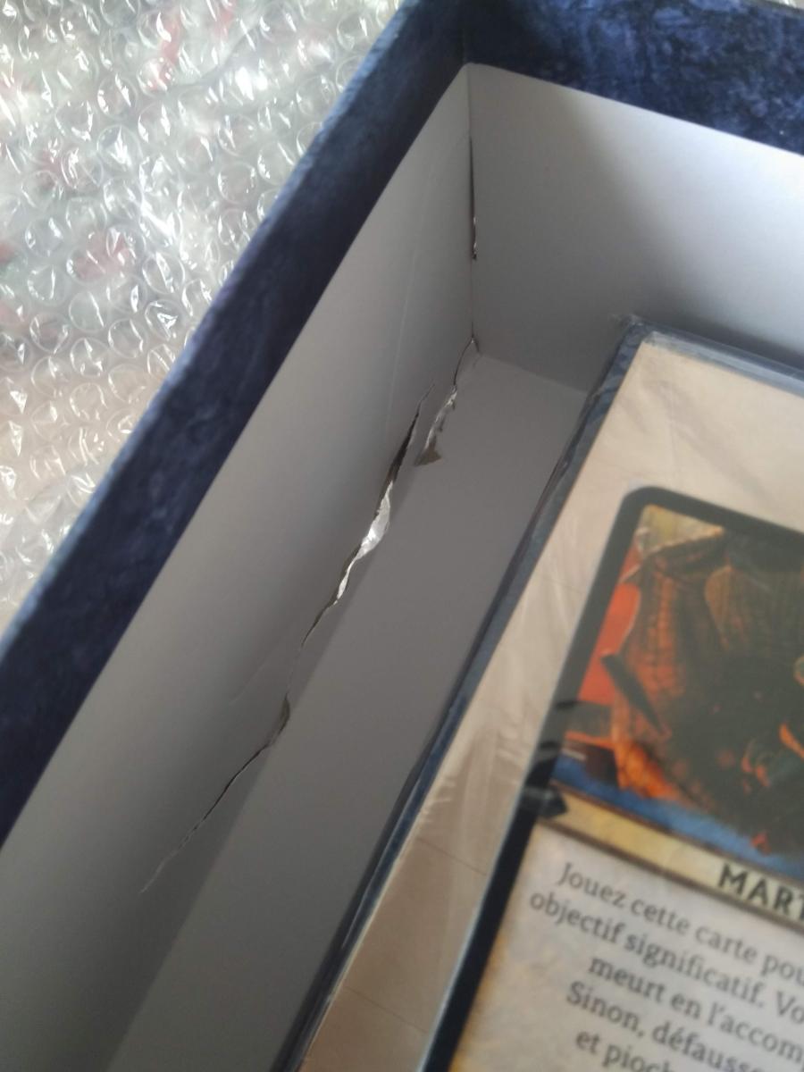 A vue de nez, vu le double grosses bulles + petites bulles à l'extérieur, je pense que c'est le contenu de la boite, en étant baloté dans tous les sens, qui a défoncé la boite !