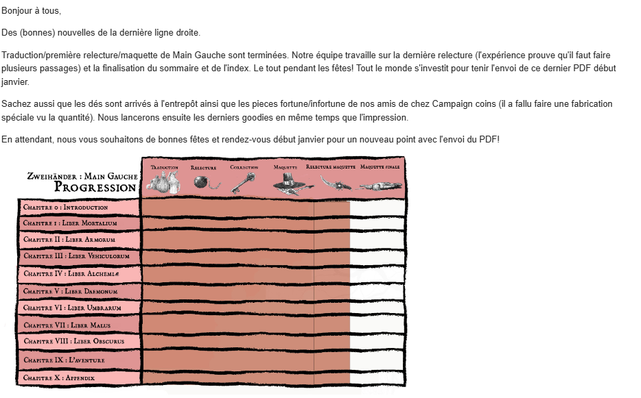 Nous gardons le rythme d’une news mensuelle sur les projets en cours. Le livre de base de Zweihander est fini à 95 % et l’extension avance bien. Le Cercueil Enchainé pour DCC est chez l’imprimeur et la Péril sur la planète pourpre est en souffrance de chapitres inédits de l’éditeur américain, mais ça nous permet de finir les modules supplémentaires en option de la campagne.
