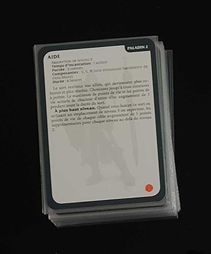 Avec des protèges-cartes transparents, il est même possible d'annoter les cartes avec un marqueur effaçable. Ici Belgrìm le Paladin dispose de sorts considérés comme toujours préparés. La carte au-dessus de la pile sur l'image dispose d'un point rouge indiquant cela.