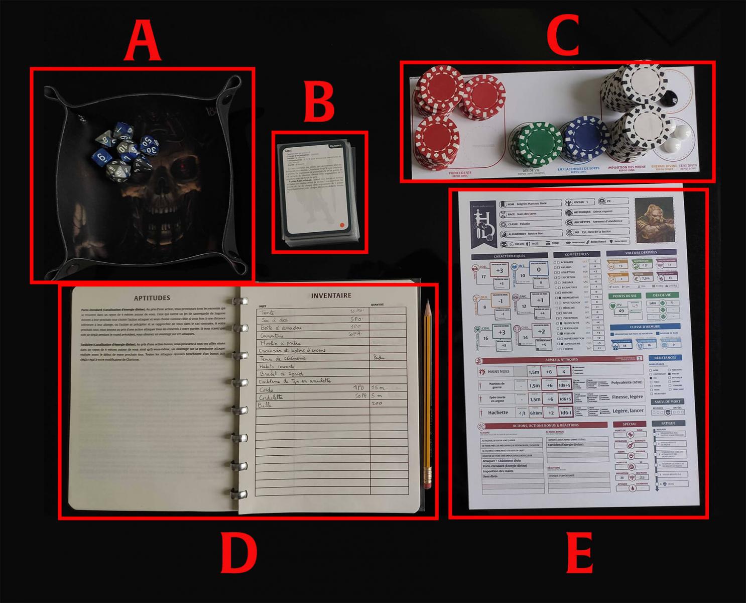 Pour les dés, un jeu complet par joueur plus quelques dés en fonction de la classe. Pour Belgrìm le paladin, c'est quelques d6 et d8 en plus. Et bien entendu un d20 supplémentaire pour les avantages et les désavantages.