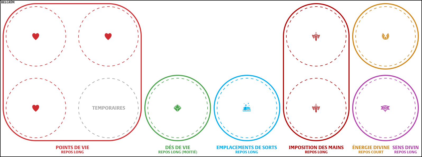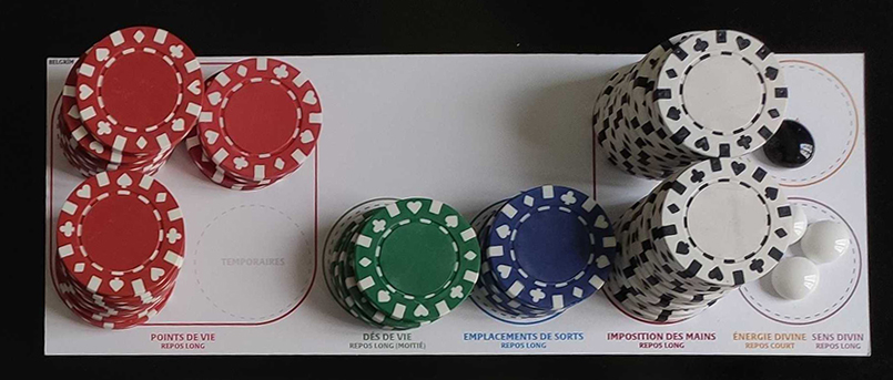 Dans le cas de Belgrìm, n'ayant pas assez de couleurs de jetons de poker, nous utilisons quelques billes plates en plus pour les sens divin et la canalisation d'énergie divine.
