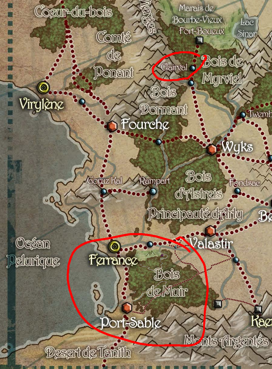 En fait, Clairval est le point de départ de la campagne Anathazerïn, et se trouve dans le quart nord ouest des Terres d'Osgild. L'aventure proposée ici commence dans le quart sud ouest des Terres d'Osgild, avant de partir plus loin au sud.
