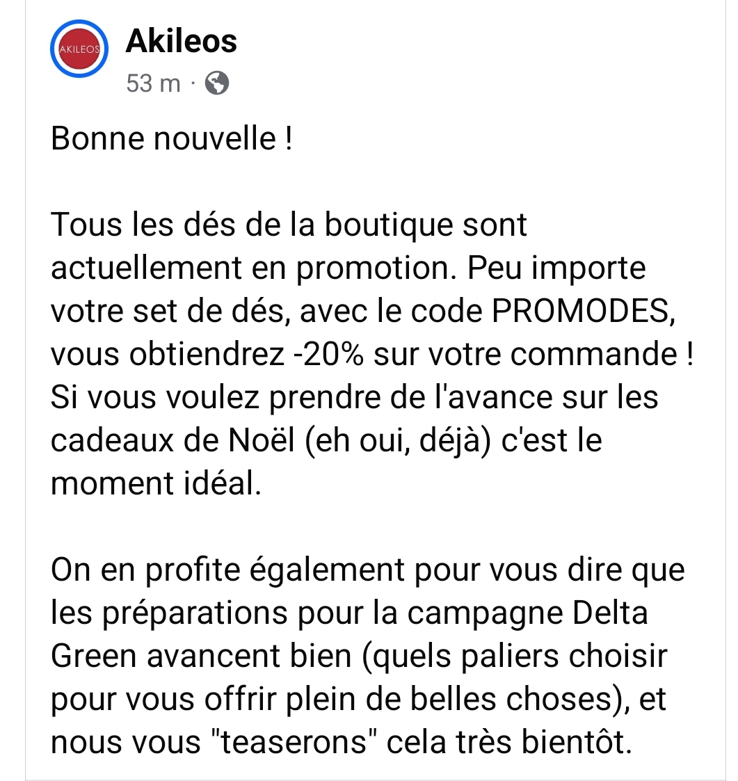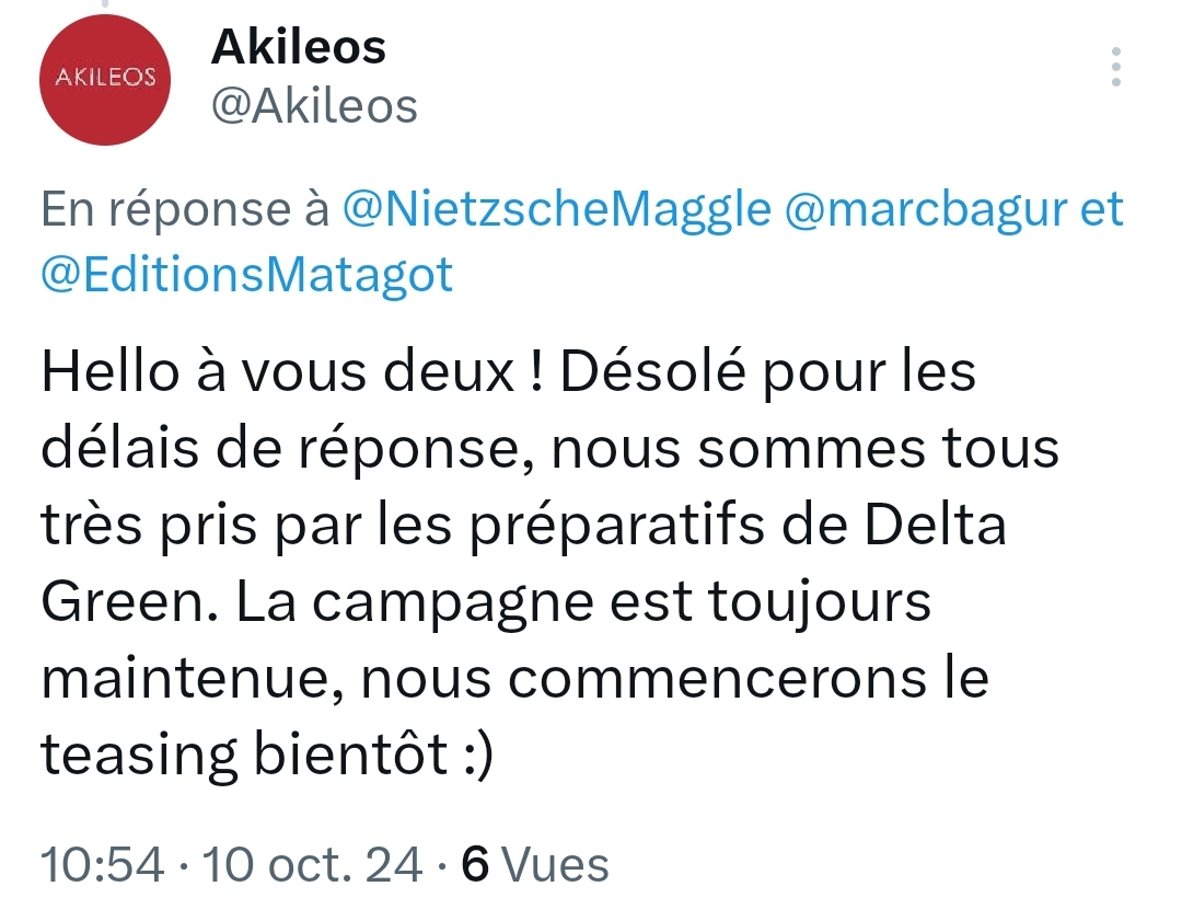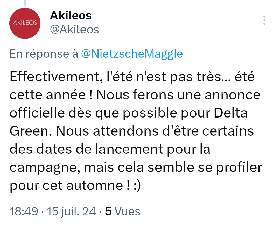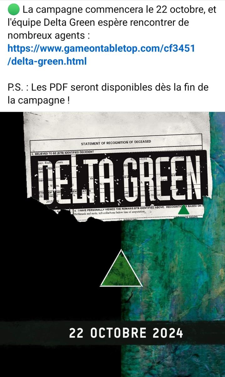 Delta Green en DE (Ulisses Spiele) débute dans 3 jours sur GameOn. Faites attention, je me suis fait avoir ce matin, j'était déjà en mode "cool, la VF revient plus vite que prévu".