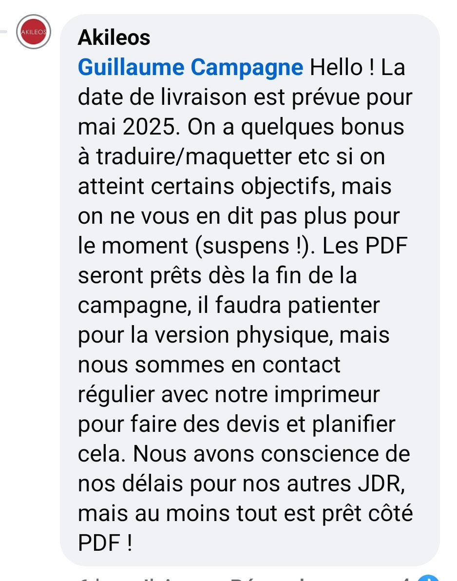 Vu que les PDF doivent être disponible dès la fin de la campagne si il y a un peu de taf de correction ou de maquettage et si il faut représenter pour validation ça peut vite prendre un petit mois ce genre de chose.