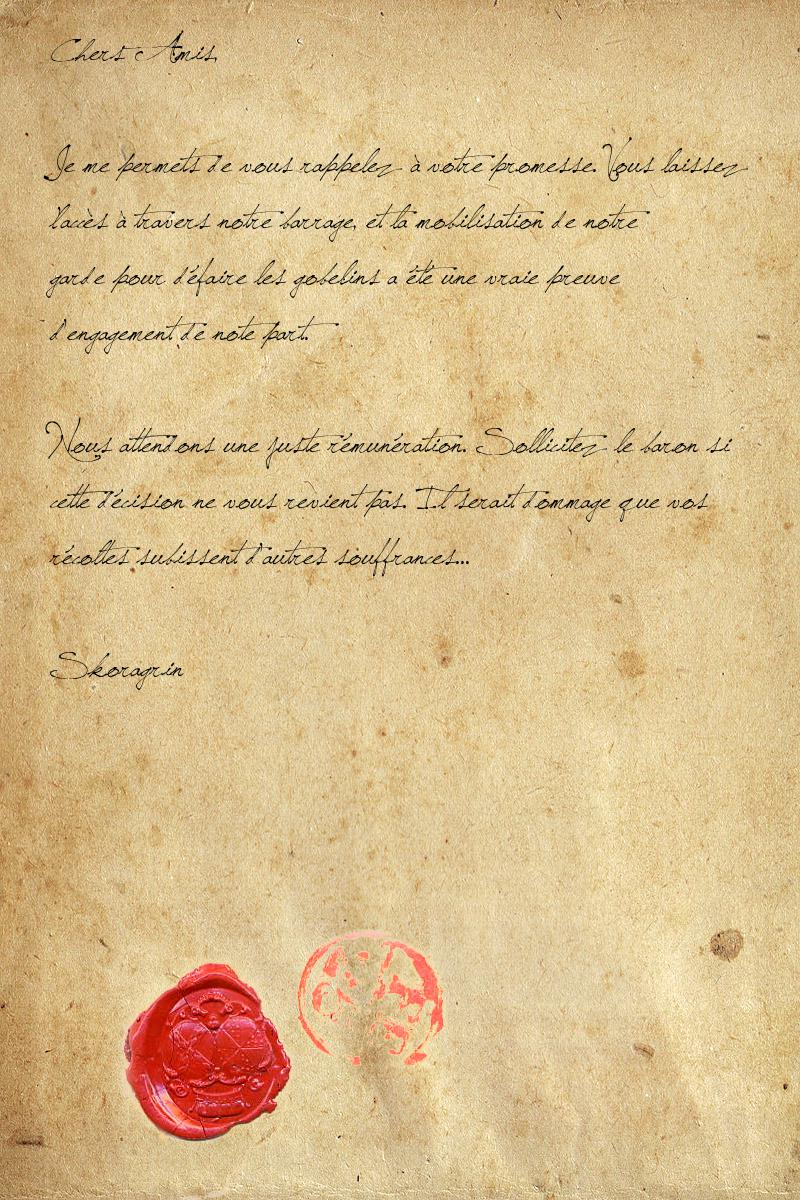 - Thorgrim recevra un doux rappel de menace quant à la « juste rémunération » attendue par le Clan Dure Mort au barrage suite à l’aide fournie pour défaire les gobelins, indiquant qu’il n’hésite pas à faire passer le mot à l’intendant Meryom pour acter d’une décision.