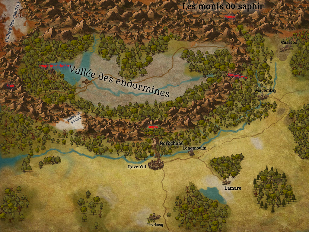 Pour la cartographie, je me suis servit la carte de Bourbvieil (dans un casus belli précédent), avec un peu de photoshop pour renommer les villes et hop! le tour est joué! Par contre les 3 clochers ainsi que les endormines n'apparaissent pas dessus (ce qui ne me choque pas puisque les PJ découviront eux même l'existence de la vallée et de son contenu, qui lui n'a pas forcement besoin d'etre réellement cartographié). Ca permet de rajouter un peu d'animation dans la partie civiliée de raven'ill et un petit bac à sable sympa!