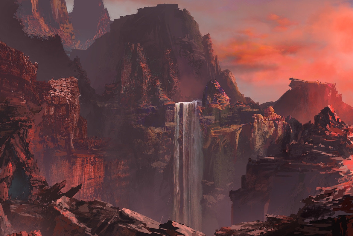 J'ai également trouvé une image sympa pour représenter les montagnes rouges que j'ai mise dans une scène "d'attente" et que je comptais réutiliser pour le passage de la chaussée des rois nains. Désolé, je n'ai plus la source, et pas réussi à la retrouver via google