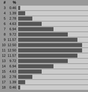Alors que sur 3d6, on va avoir une forte probabilité de 10-11. Plusieurs dés, chaque face peut être compensée par répartition sur les dés. Par exemple, on peut faire [1-4-6], [3-5-3], [2-3-5], etc. Moult combinaisons pour faire des scores autour de 10-11. Alors qu'à l'inverse, les extrêmes (3-18), sont plus difficiles à atteindre puisqu'ils impliquent de faire 3 fois le même score sur chaque dé. Il y a donc beaucoup moins de combinaisons possibles (une seule pour les extrêmes).