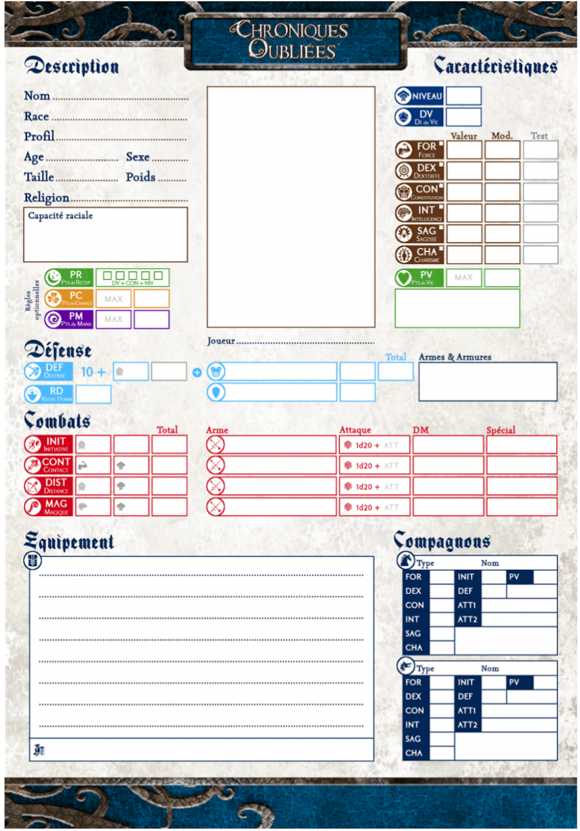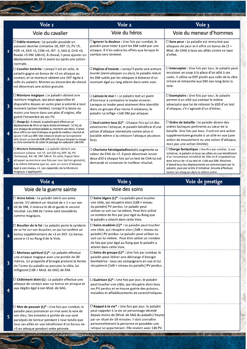 Est ce qu'il existe des fiches de personnages avec les voies déjà remplies ? Une fiche de voleur, de druide, de chevalier, de barbare, etc... que mes joeurs n'auraient plus qu'à compléter avec leurs caractéristiques, PV, ATD, ATC, ATM ...
