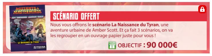 Sachez que le résultat de la PP Mutants & Masterminds va bien au-delà de ce que l'on imaginait. Pour accompagner ce véritable succès, nous avons mis en chantier la traduction de ces scénarios, mais à ce stade, pour tenir nos délais, nous préférons nous en tenir à un dernier objectif à 100 000€.