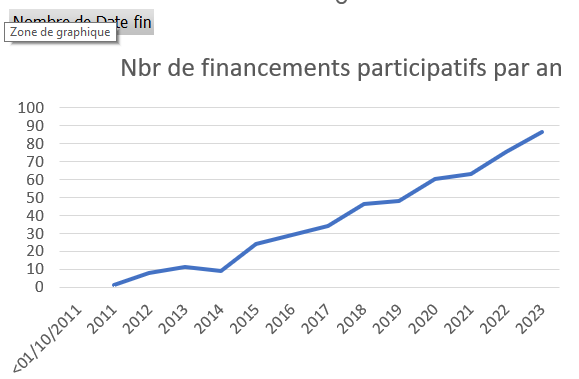 Je me suis amusé à faire un petit graphique du nombre de financements participatifs par an (ça a peut être été déjà fait). La courbe est éloquente