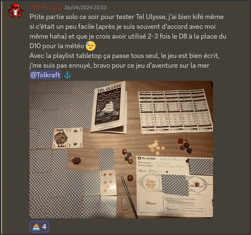 Un petit retour de partie de Joli Rouge (avec sa permission), posté sur le Discord de "La Cale" :
