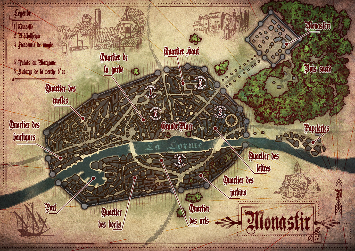 Il y a la bibliothèque dans le quartiers des lettres ça c'est bien. Par contre je n'ai pas de moine, j'ai un prêtre qui pourrait peut être profiter du monastère (il y a un bois à côté mais pas encore d'idée..). Le port et les docks doivent pouvoir être exploités. Je vais placer les boutiques d'armes et armures dans le quartier des boutiques et les potions et parchemins dans le quartiers des arts, près de l'académie de magie qui pourra servir aussi au prêtre. Il y a des pickpocket vers la grande place et je pense que je vais faire une course poursuite avec des voleurs. Et je vais aussi laisser mes PJ appercevoir Lucius dans la foule sans qu'il puisse l'interpeller après une "fausse" poursuite (s'ils y passent avant la maison d'Emarin bien sûr). Je vais placer Nestor dans le quartier des ruelles et je ferais bien une embuscade de brigands dans ce quartier là qui s'y prête bien avec ses ruelles je trouve