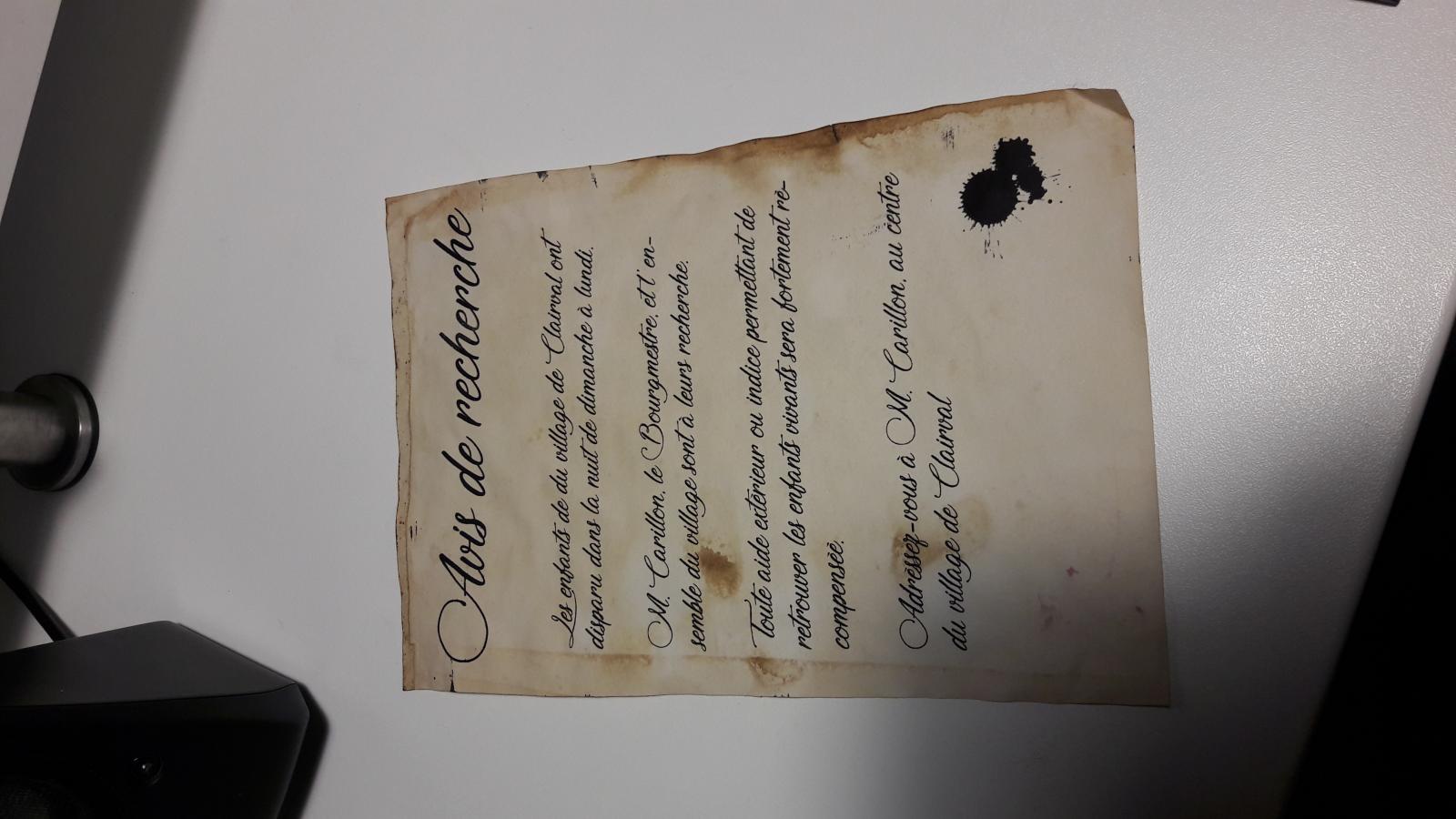 Et à l'instant, un petit parchemin A5 avec l'avis de recherche des enfants disparus de clairval (papier préparé il y a quelques jours café / thé et au four). Je m'amuse bien