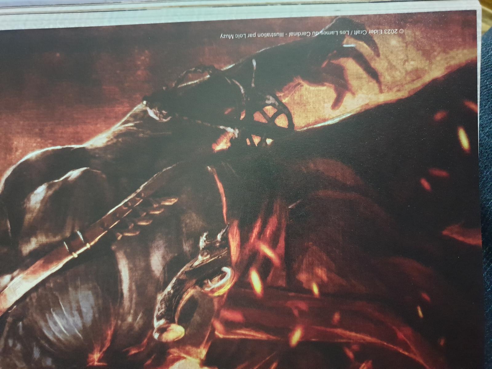 Ça prend la forme de "(c) 2023 Elder Craft / Les Lames du Cardinal - Illustration par Loïc Muzy" (car illustrateur principal mais variantes avec autres illustrateurs aussi) en general sur le long du bord vertical gauche de la page gauche, ou vertical droit de la page droite, et non pas sur chaque illustration. Mais pour certaines demie-pages ou pleines pages, cela vient effectivement s imprimer sur l illustration et non pas dans une bordure (puisque pleine page). Mais ce n est pas non plus a chaque page qu il y a une illustration sous copyright. Mais bon en feuilletant une fois qu on l a vu ça gâche certaines illustrations je trouve.