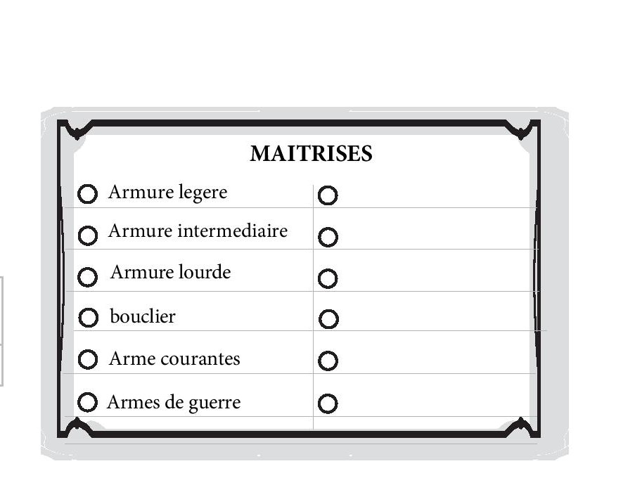 perso, il me manque un encart avec les compétences d'armes/armures, comme sur la fiche maison que j'utilisais en DD3.5: