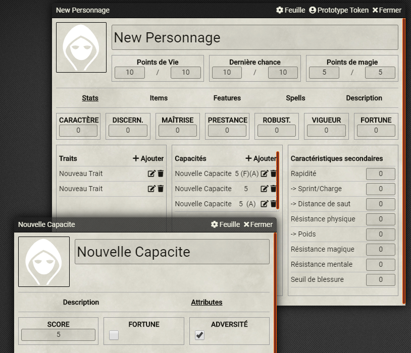 J'ai commencé à bosser sur une feuille de perso pour le logiciel FoundryVTT. Ce n'est vraiment que le début, il faut que j'automatise un peu, améliore l'aspect graphique et détermine comment je vais présenter les autres onglets, mais c'est plutôt en bonne voie (pour l'instant Fortune et Adversité sont notés (A) et (F), il faut que je les remplace par les flèches/triangles)