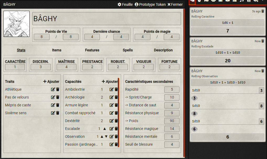 Pour l'instant je tâtonne pour essayer de déterminer la manière la plus élégante d'intégrer les dés de fortune/adversité. Je pense que je vais quand même devoir passer par une fenêtre pop-up à chaque jet pour éviter de trop encombrer la feuilel de perso et gérer les dés de circonstance...