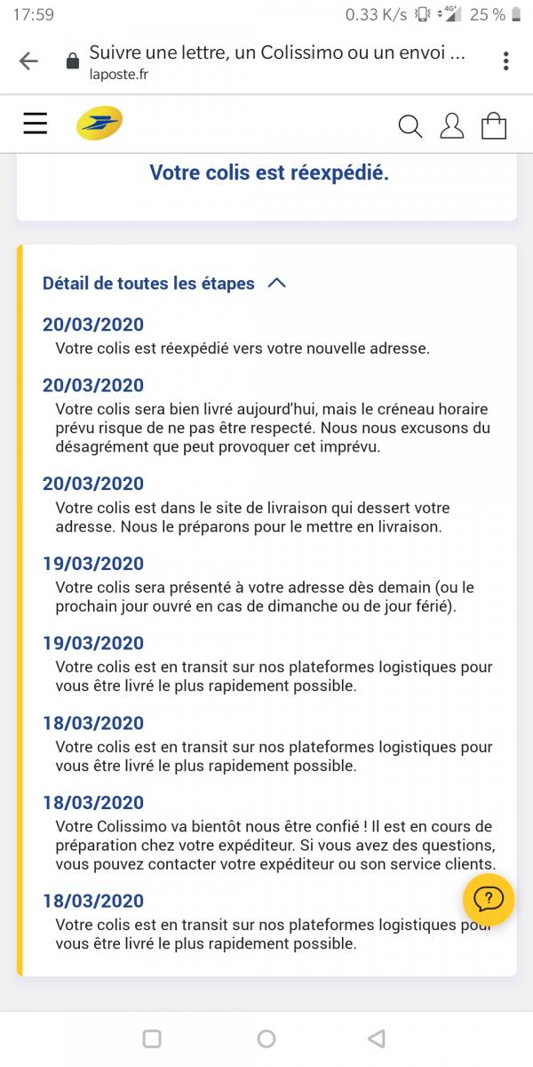 Pour ma part un peu inquiet : mon colis devait être livré hier. Au final rien... Et le suivi Colissimo indique qu'il va être réexpédié à ma "nouvelle adresse" ! 🤔