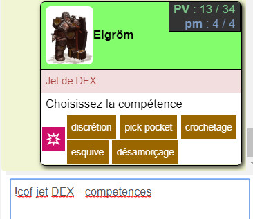 - exemple : !cof-degainer ?{Arme en main ?|Pétoire,0|Épée,1|Aucune,-1} avec initEnMain0 = 10