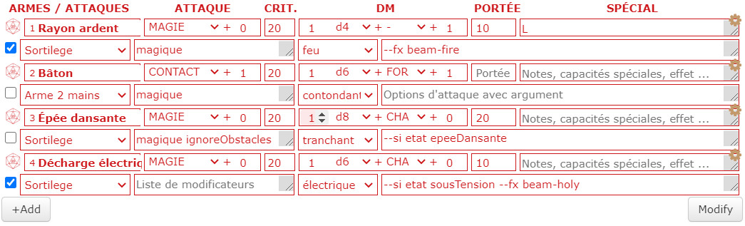Puis un champ de modificateurs. Ce champ peut servir pour les options simples, qui ne demandent pas d'argument. Il suffit de mettre les mots-clés des options, separés par des espaces. Typiquement, on peut y mettre que les dégâts sont magiques, ou bien qu'il s'agit de dégâts temporaires, ou encore qu'il s'agit d'une arme à poudre, etc.