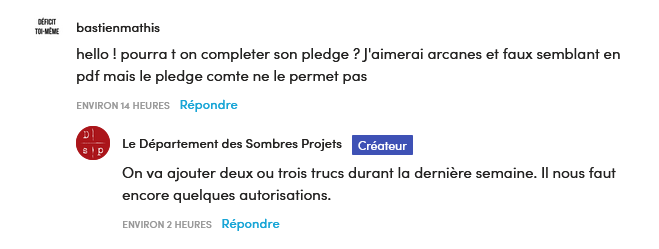 Mais je te conseille vivement de poser directement ta question sur la page Ulule, ou en MP au Département des Sombres Projets, tu auras ta réponse !