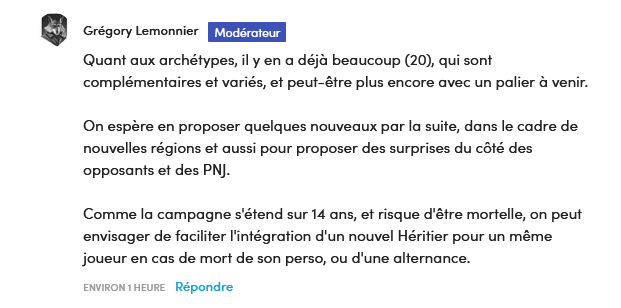 EDIT : Donc pour préciser un peu, cette contrepartie "écran + dossiers du joueur" va surtout être là pour les gens qui ont pris des contreparties inférieures et qui veulent obtenir l'écran et les dossiers sans devoir débourser le prix d'une contrepartie Duc ou Monarque (par exemple ceux qui ont pris une offre "tout PDF" et qui veulent quand même un écran pour jouer à leur table). En plus des joueurs comme moi qui veulent avoir 5 dossiers du joueur supplémentaires et un écran avec visuel alternatif pour varier les ambiances de jeu.