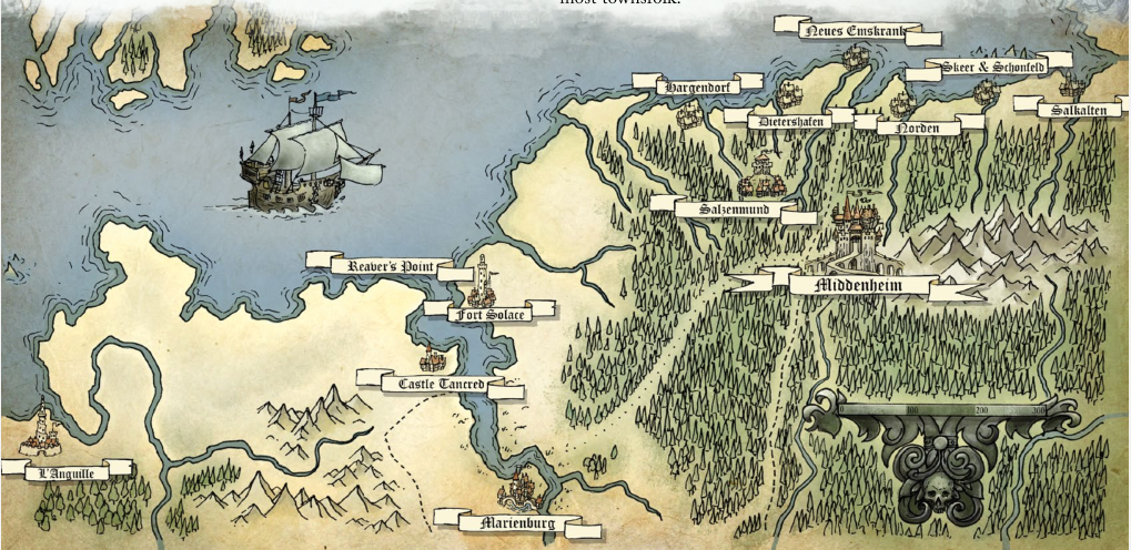 La côte du Nordland - Vu son travail sur Salzenmund, il était donné que ce chapitre allait être important pour Cubicle 7. On commence par une grosse description de cinq pages sur la flotte impériale bienvenue car jusqu'ici coincée dans un supplément VO de la seconde édition (Shades of Empire). On enchaîne sur une la description de plusieurs ports d'attache : Dietershafen, le haut lieu de la marine impériale, Neus Emskrank, l'archétype du port déprimant (basé sur les ports Britanniques à l'agonie mais mes frères bretons apprécieront) et Norden, un port fondé par des immigrants Norsca avec un secret.
