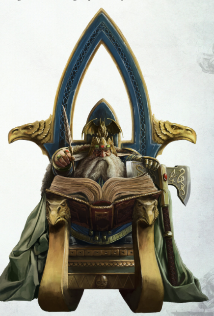 Ce gros chapitre qui représente près d'un tiers du livre (eh oui...) offre un panorama de l'empire nain vieillissant et assailli de toute part par des forces hostiles dans les montagnes du bout du monde. On y décrit aussi la structure politique de l'empire avec les rois, les thanes, le conseil des anciens. Fidèle à lui même, Cubicle 7 donne plusieurs profils de rois nains avec le système de patrons que je ne vous présente plus. On retrouvera notamment le haut roi, Thorgrim Grudgebearer, le roi de Karak Azul, Kazador Thunderhorn et Ungrim Ironfist le roi Tueur. Le gros du chapitre dépeint un panorama assez étendu des forteresses trouvées tout du long de l'empire (montagnes noires, la voûte et les montagnes grises). On a même le droit aux karaks de Norsca ! Les mines et les karaks tombés ne sont pas oubliés. Tout cela est illustré par une double carte que je n'ai pas trouvé très belle mais qui a le mérite de situer chaque forteresse géographiquement. Comme d'habitude, on finit par un gazeteer de deux pages pour connaître tous les chiffres qui vont bien : dirigeant, population, biens produits, etc.