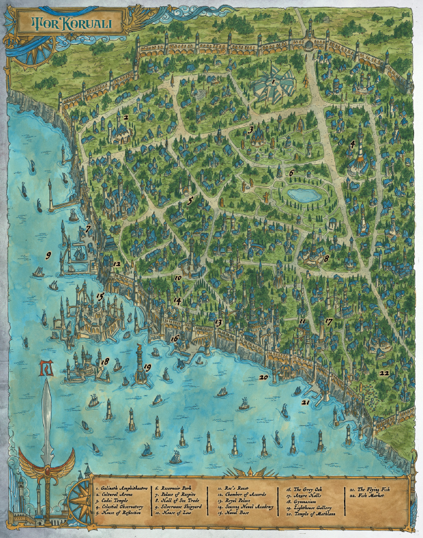 On est peu ou prou sur un mini Middenheim avec une description quartier par quartier de la ville avec ses nombreux palais (il y a sept princes(ses) après tout !), ses monuments, ses lieux de cultes (officiels ou non), ses alentours et ses grottes souterraines. A chaque fois, on retrouve des profils de PNJ liés à l'endroit décrit : une sommelière (je rigole pas), le goûteur du prince, une espionne Norske, un aventurier impérial à la retraite, la présupposée aux douanes (attention, c'est une archimage) et bien sûr le prince de Tor Koruali, ses enfants (ineptes) et ses adversaires politiques. Bon les stats... ce sont des elfes quoi.