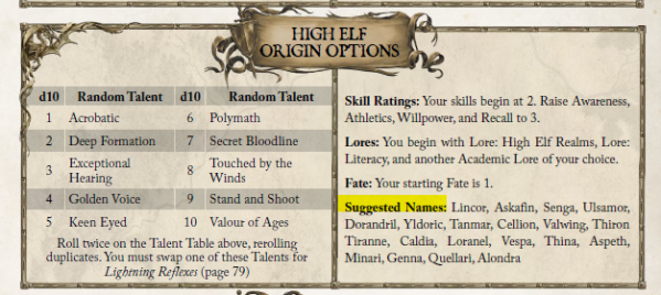 Par contre, il y a des erreurs dans le PDF. Dans la table des noms pour les Hauts-Elfes on peut trouver Jacques, Raoul, Monique ou encore Gisèle... Sur le moment ça fait sourire, mais si ça sort tel quel dans la version imprimée, ce sera moins drôle. Et il y a d'autres petites erreurs ici et là. Rien de catastrophique mais voilà.