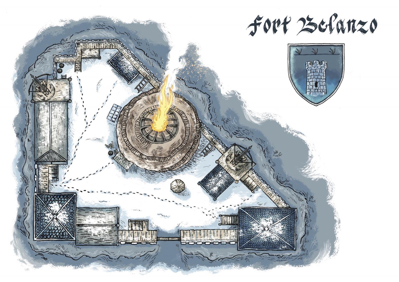 Soldats de la Garde du froid, voici Fort Belanzo où vous allez vraisemblablement prendre vos quartiers. Il y a tout ce qu'il faut ici pour survivre au froid et aux attaques des Orcs. Vous devrez entretenir en permanence la Tour de Feu afin que Fort Caspard et Fort Abad vous distinguent dans la nuit et sachent que tout va au mieux. Si cette flamme venait à s'éteindre ils viendraient aussitôt à la rescousse. Et si Caspard ou Abad s'éteignaient ce serait à vous de partir les aider.