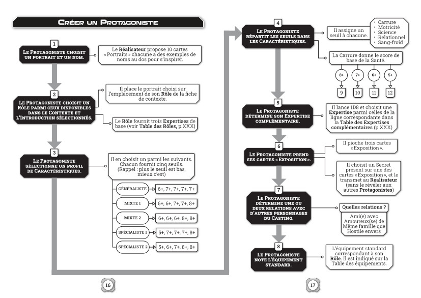 SHS utilise plusieurs diagrammes pour expliquer les mécaniques de jeu principales, notamment la création de Protagoniste. Cela permet d’avoir, d’un seul coup d’œil, toute la procédure sans s’embarrasser de texte superflu..jpg)