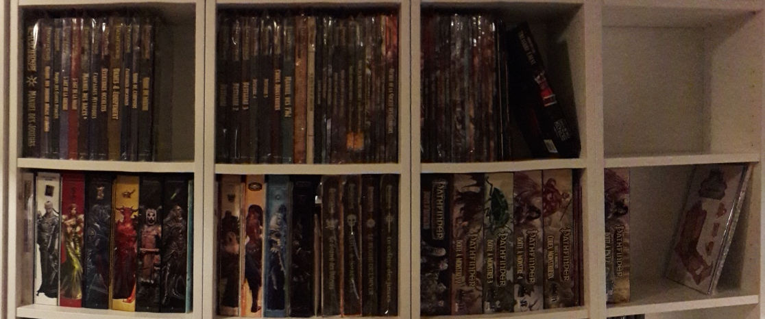 Il faut entre temps rajouter le régent de jade. Si on aligne la collection pathfinder VF + VO j'estime qu'il faudra environ 3,6m à 4m linéaires (9-10 compartimnets de builiothèques BILLY de 40cm de large) pour faire tenir les 400+ ouvrages de la gamme. Sans compter les boites à monstres qui prennent une sacré place. Un échantillon de ce que ça représente rien qu'avec la VF (ça date d'il y a deux ans, j'ai rempli deux étagères supplémentaires depuis).