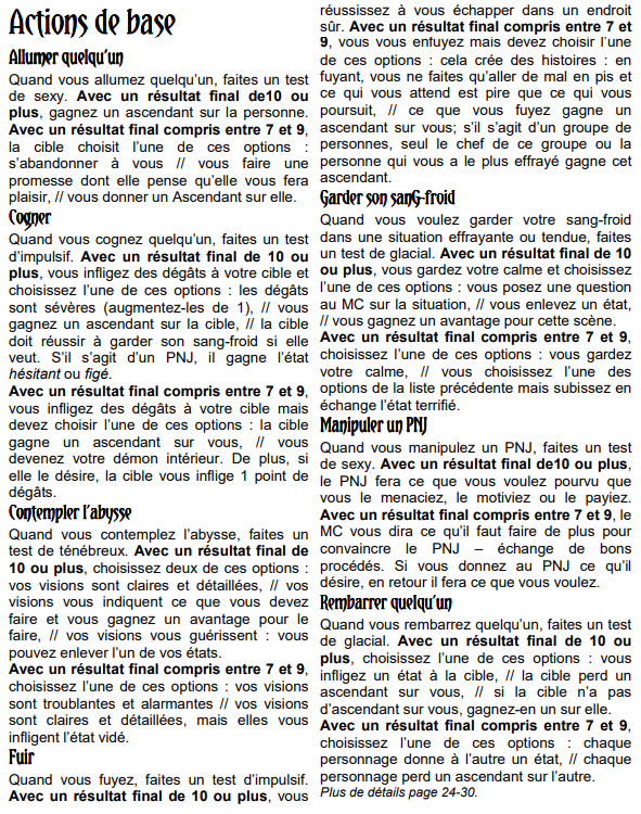 Du coup, c'est un peu ce que je disais : les jeux PBTA sont très narrativistes dans le sens où les livrets incitent fortement les joueurs à choisir certaines actions plutôt que d'autres, et particulièrement celles qui correspondent au tropes de la narrations, en fonction de l'archétype du personnages qu'ils ont choisi : ce sont celles qui sont inscrites dans son livret.