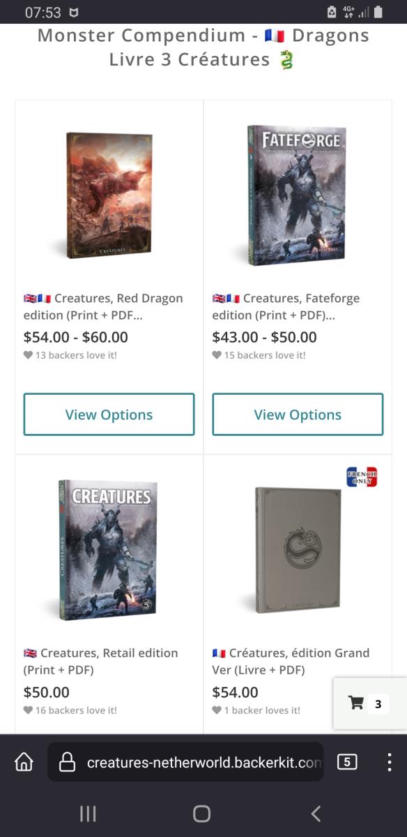 Il y a quelques articles dispos en Anglais seulement, mais ils sont peu nombreux et on est bien guidé par les petits drapeaux devant le titre de chaque ouvrage ou lot. S il y a plusieurs drapeaux c est quvil y a un menu déroulant pour choisir sa langue une fois rentré dans l article pour avoir sa description. La newsletter prévenait que si jamais malgré tout le français n est plus proposé dans les choix malgré le descriptif, c est qu il est en rupture pour la langue souhaitée, mais peu probable au 1er jour du backerkit.