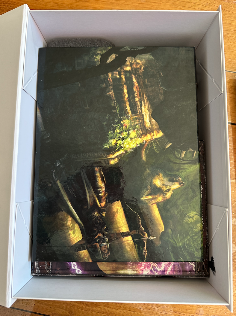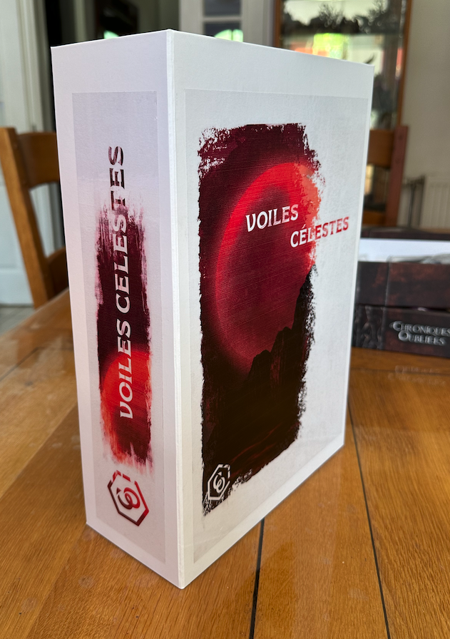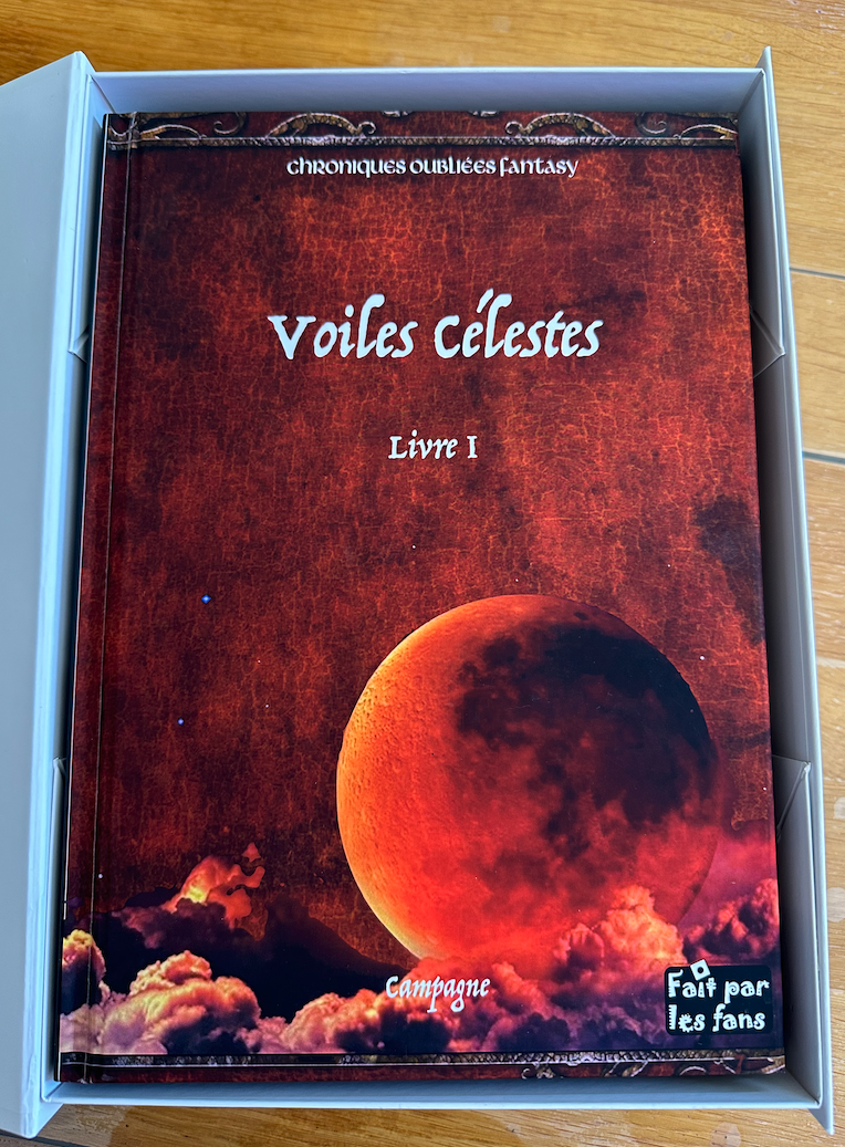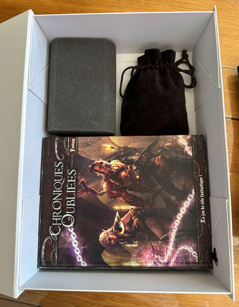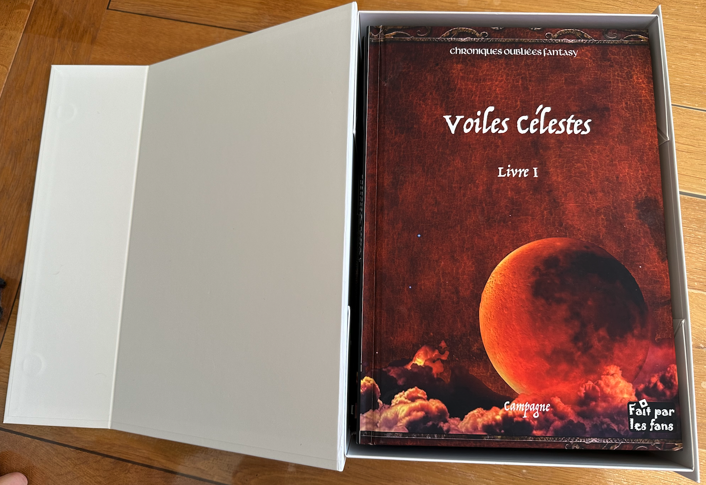 Une boite blanche à rabas magnétique, des stickers imprimés et je peux ranger le livre de base, le compagnon, l'écran, les dés et la campagne COF1. Pour COF2, j'attend les livres pour ajuster la mousse (là, c'était un proto) et voir ce qui tient dedans.
