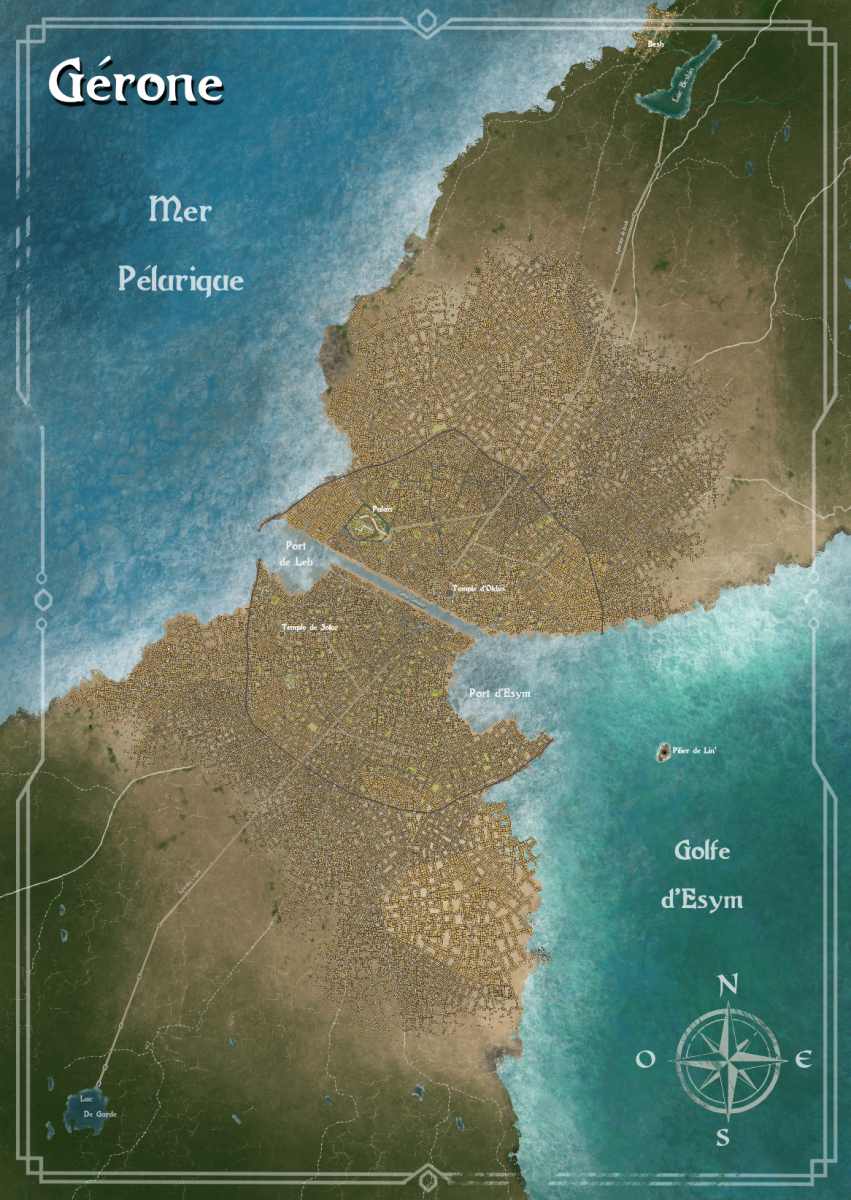 J'avais créé, il y a longtemps, un plan plus que simple de la cité de Gérone pour les scénarios 5 et 7. La reprise de ce plan me trottait dans la tête depuis une éternité. Comme j'ai maintenant un peu de temps, voici un brouillon du plan de la cité (manque de nombreuses choses comme l'échelle, des noms de lieux en pagaille...) :