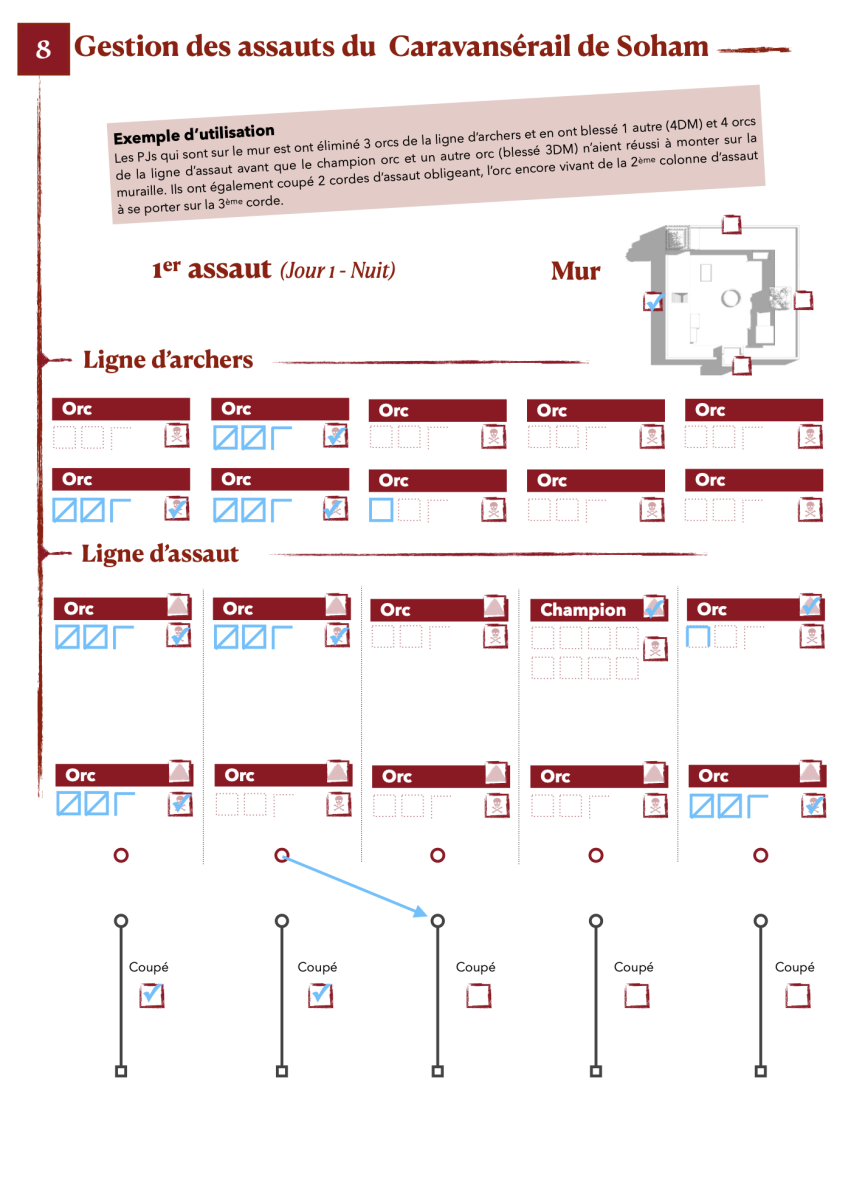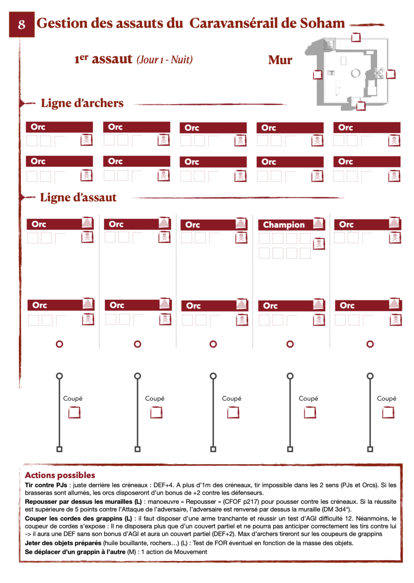 Dans le livret d'accessoires pour le MJ, j'ai ajouté une aide de jeu pour gérer les assauts du caravansérail du 8ème scénario. Un exemple a été ajouté également pour comprendre comment l'utiliser. En espérant que cela sera pratique. N'hésitez pas à me faire remonter des améliorations.