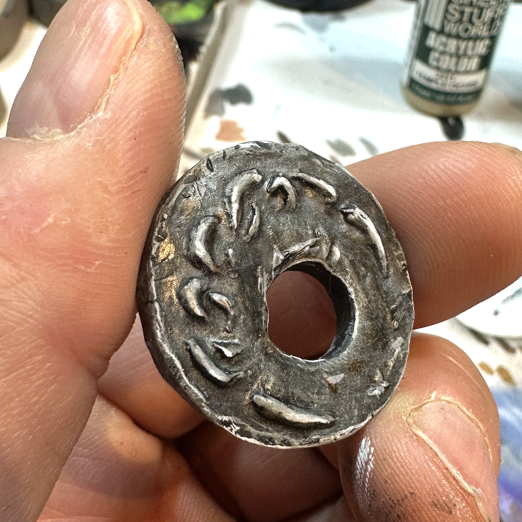 Comme je n'ai pas d'imprimante 3D, j'ai "sculpté" un emporte-pièce. Ensuite, je réalise les pièces et les vieillis en rajoutant des coups et des irrégularités. Puis, sous couche et peinture. Très artisanal !