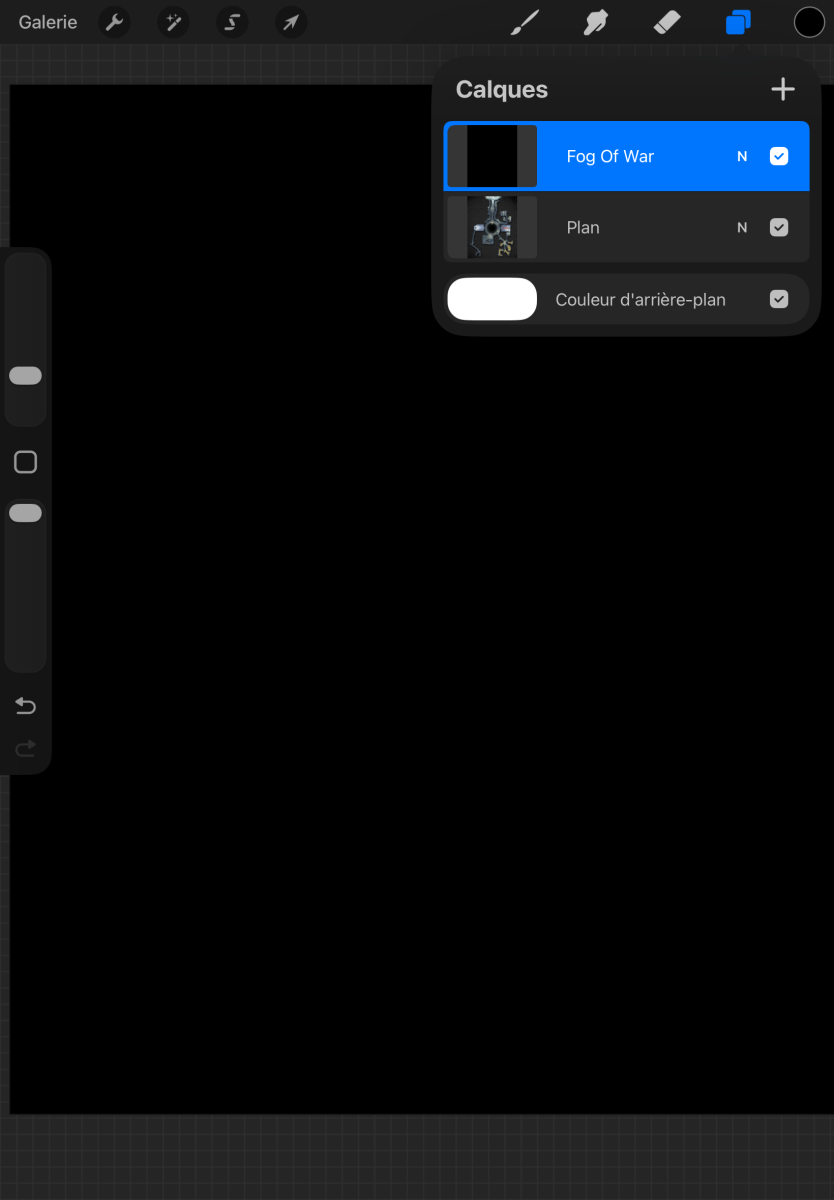 Etape 2 : Ajouter le fog of war (simplement un calque au-dessus du plan rempli de noir (par exemple))