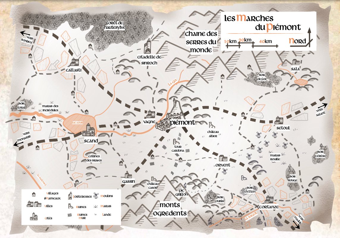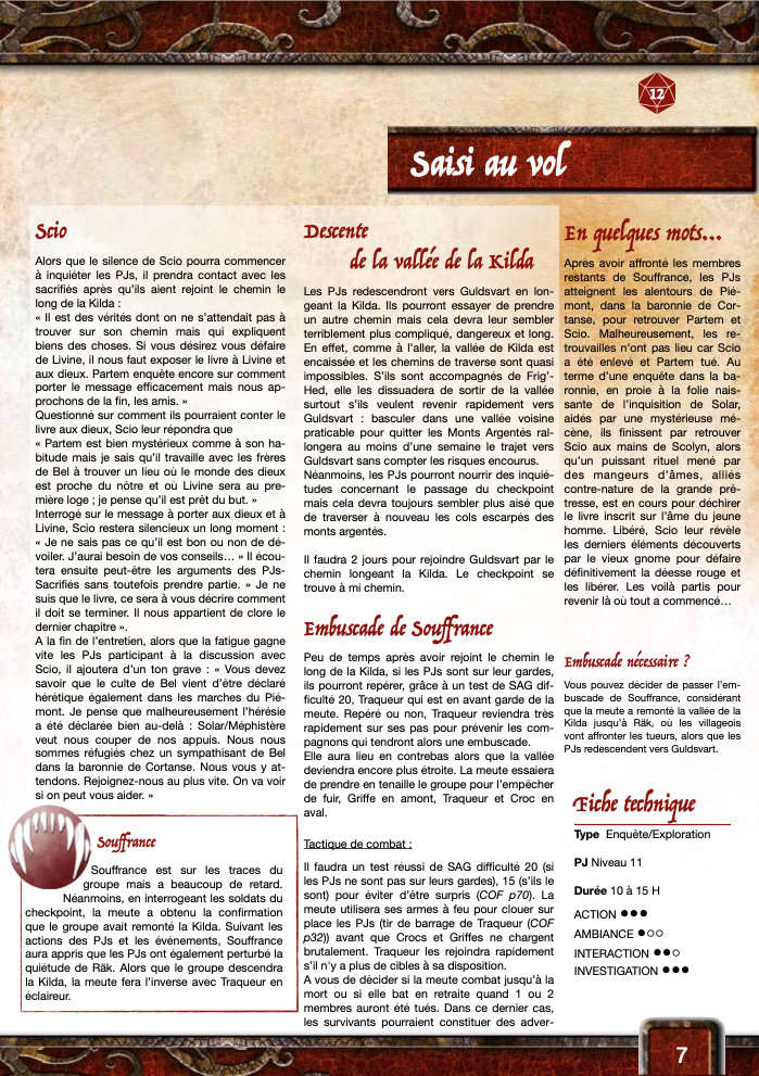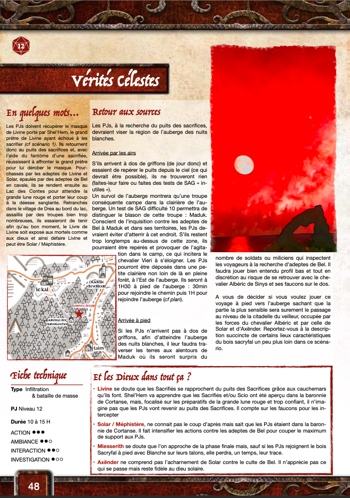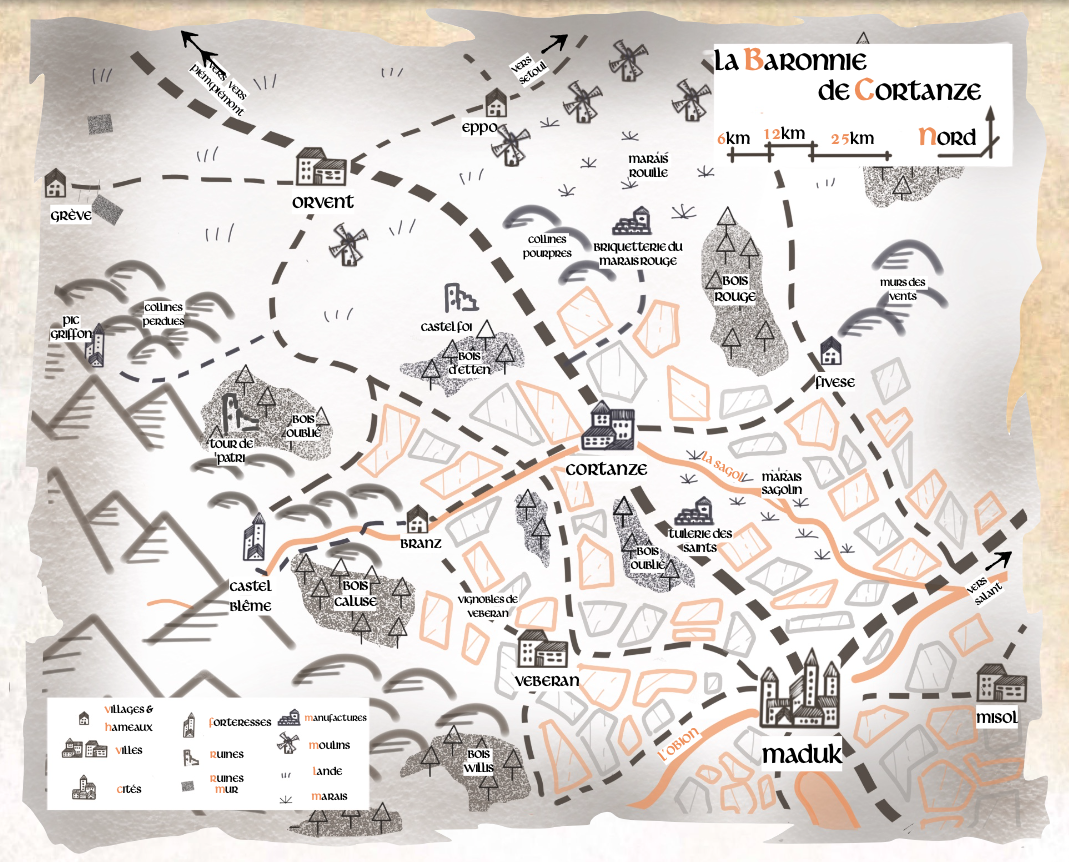 Il s'agit d'un scénario "bac à sable" qui décrit la baronnie de Cortanse située entre Piémont et Maduk. Il est assez ouvert et à tendance plutôt enquête. Malgré son nombre de pages, il devrait être moins long que les précédents (10 à 15H de jeu, je pense).