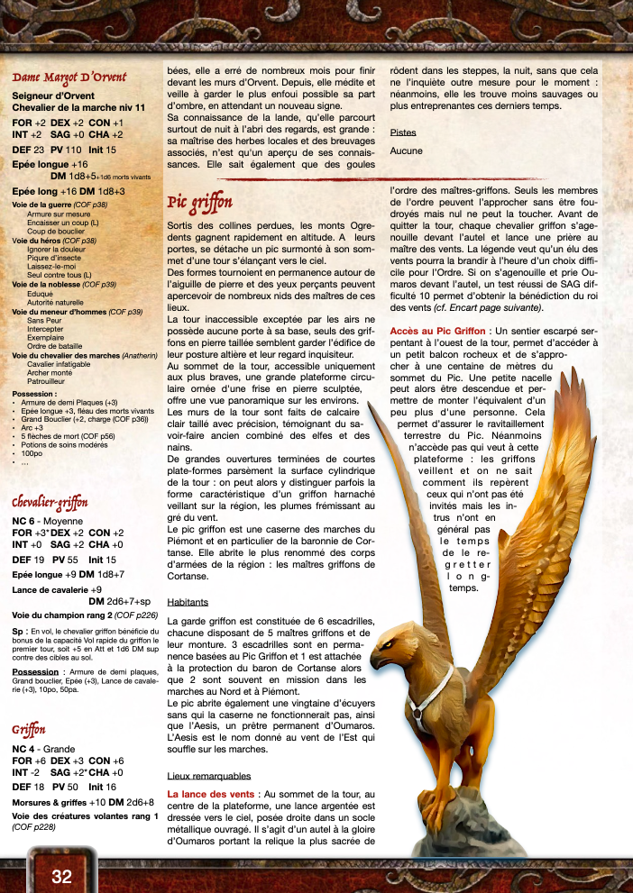 La proximité des Monts Ogredents et les marches ventées en font un lieu privilégié pour des créatures aériennes. Les PJs pourraient avoir besoin de ces créatures entre le scénario 12 et 13 :