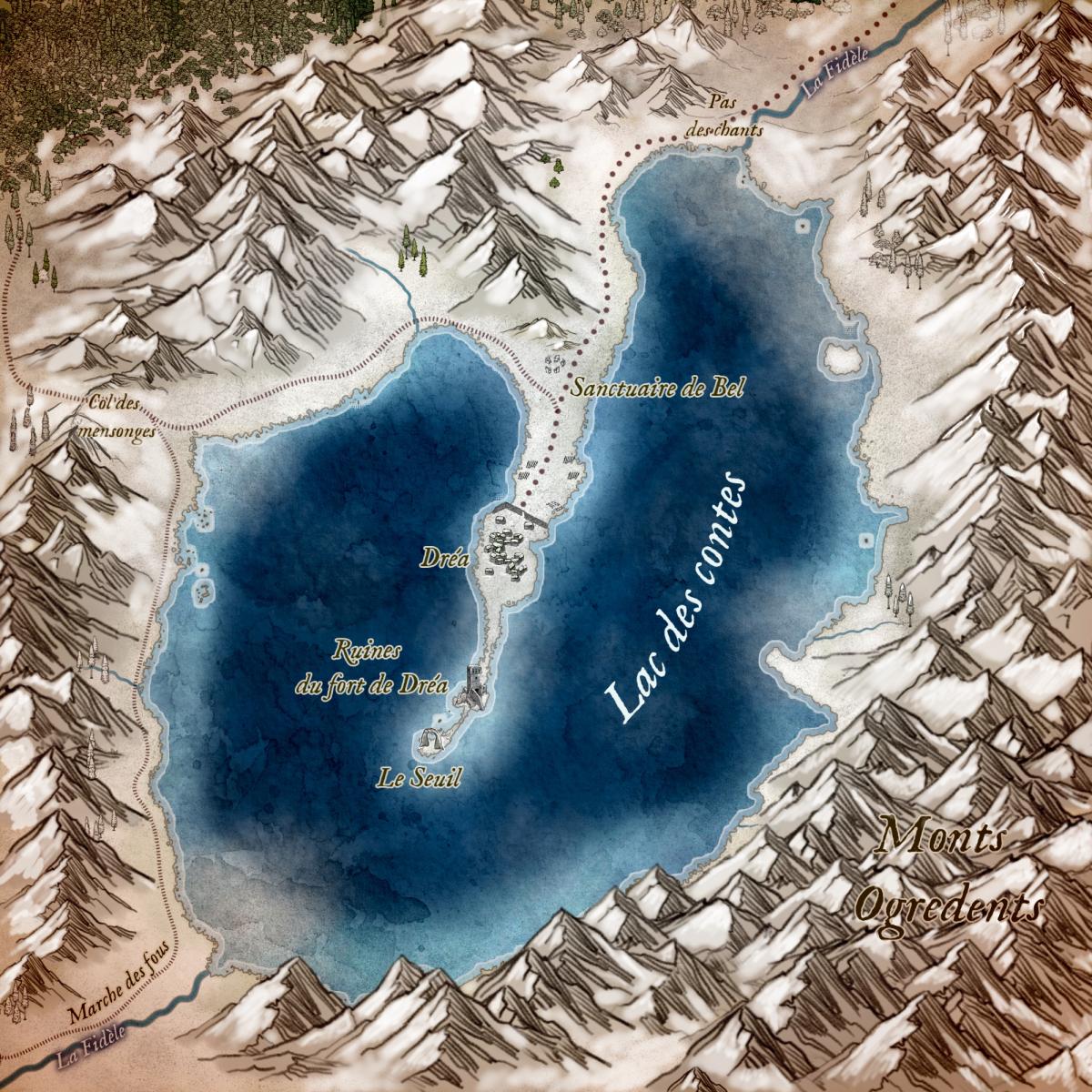 La carte du lac des contes est terminée (cf ci-dessous). Question écriture, les 2/3 du scénario sont terminés. J'ai commencé la bataille finale et dernière partie du scénario et de la campagne.