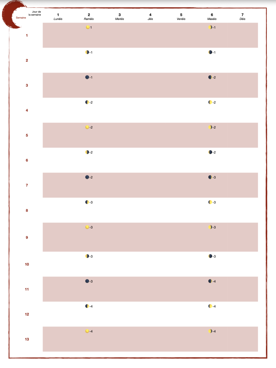 + une petite aide de jeu : le calendrier avec les cycles lunaires afin de reporter là où en sont les PJs (il est facile de perdre le fil, à mon avis) :