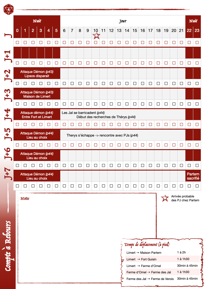 J'ai eu besoin de faire une aide de jeu pour le scénario 4 pour garder le compte des heures passées car l'enquête est en temps limité. Comme il y avait une autre aide de jeu, je les ai regroupées et un livre d'accessoires pour le MJ est né.