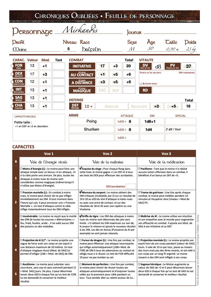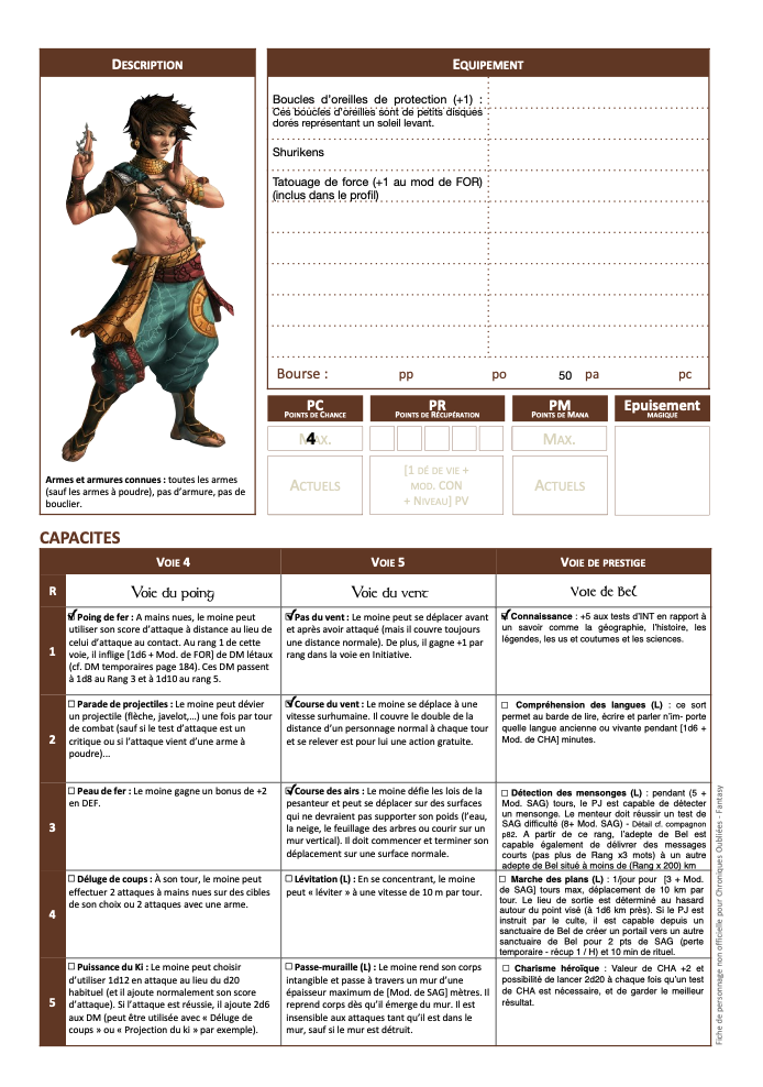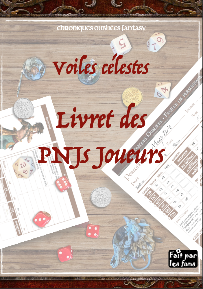 J'ai réalisé un livret de PNJs Joueurs grâce au superbe boulot de Siva sur les fiches de COF. Ce livret regroupe les fiches prêtes à jouer de 19 personnages, pour intégrer un nouveau joueur au cours de la campagne. Il s’agit de PNJs que rencontreront les PJs à différents moments des Voiles célestes et qui pourront assez naturellement se joindre à la quête.