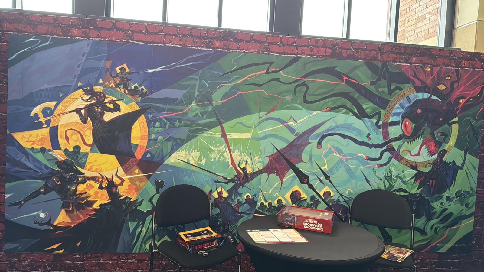 Personnellement, j’ai précommandé l’alternate du DM Book de Faerûn. Je pense que le rendu final, une fois la maquette terminée, sera plutot reussit. Elle me fait penser à ces vitraux modernes façon Chagall, où la lumière semble transpercer certaines zones, avec des aplats de couleurs vives et des formes géométriques très art déco.