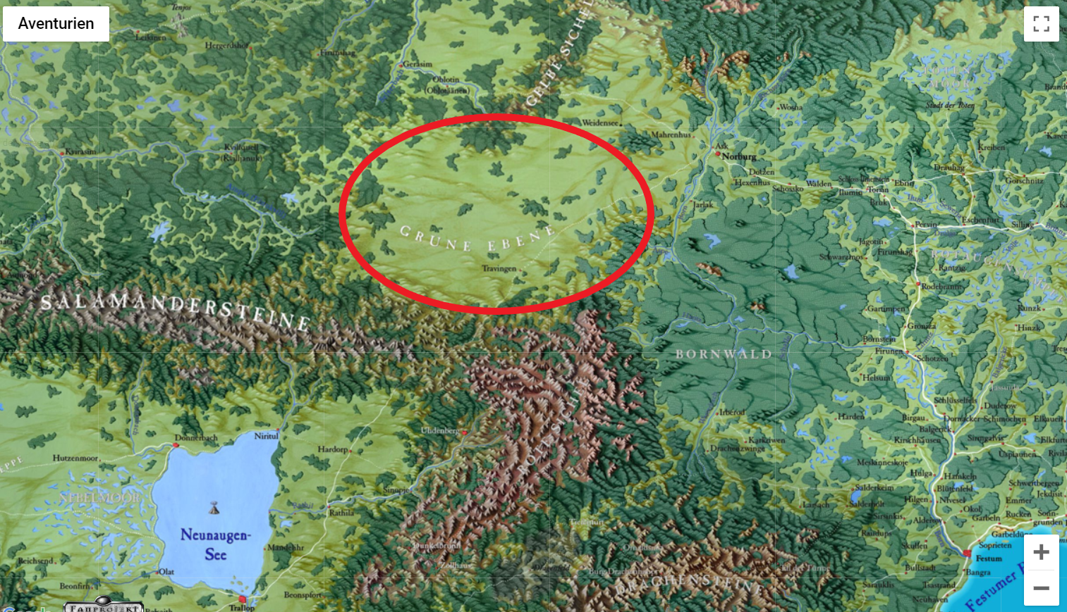 Parce qu'à cette occasion Uhrwerk Verlag a reçu l'autorisation de publier un setting régional spécial issu de l'Aventurie mais adapté aux règles de Dragonbane. Ce setting régional correspond à la région connue en allemand sous le nom de Grüne Ebene (les vertes plaines en français, ).
