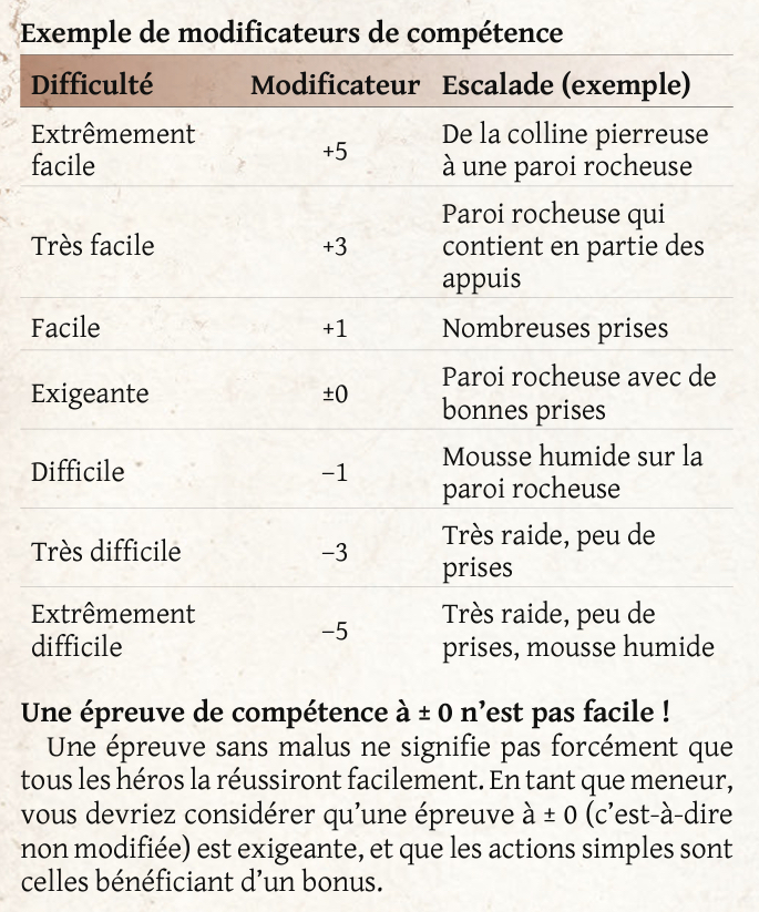 Je fais remarquer qu'une épreuve avec un modificateur de 0 n'est pas une épreuve facile mais exigeante. C'est pour cette raison que bien souvent, la majorité des épreuves devraient être de +/- 1 sinon 2 et plus rarement avoir des modificateurs supérieurs.